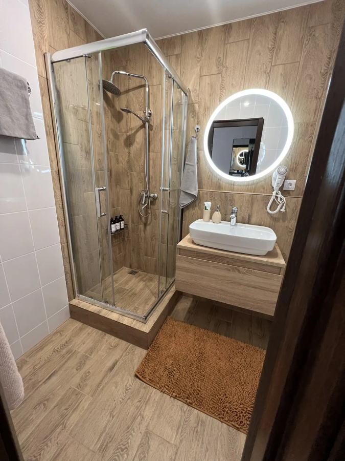 В ванной комнате: душевая кабина, халат, тапочки, фен.